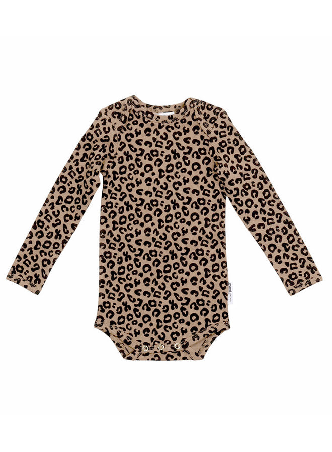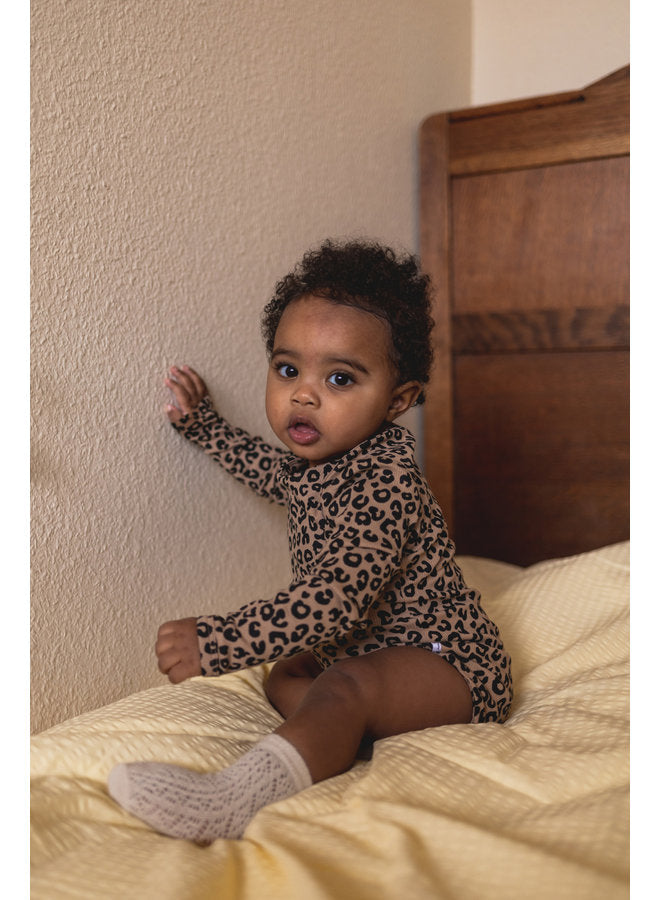 Soft, comfortable romper in stretchy, organic cotton rib fabric with an envelope neckline. The romper has all-over leopard print with long sleeves and snap button fastening.