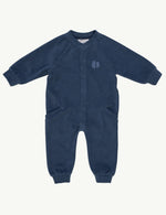 Soft organic cotton towel fabric baby onepiece with snap button closure and down to earth print at the back. The perfect item to keep your baby warm and happy.