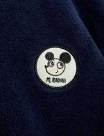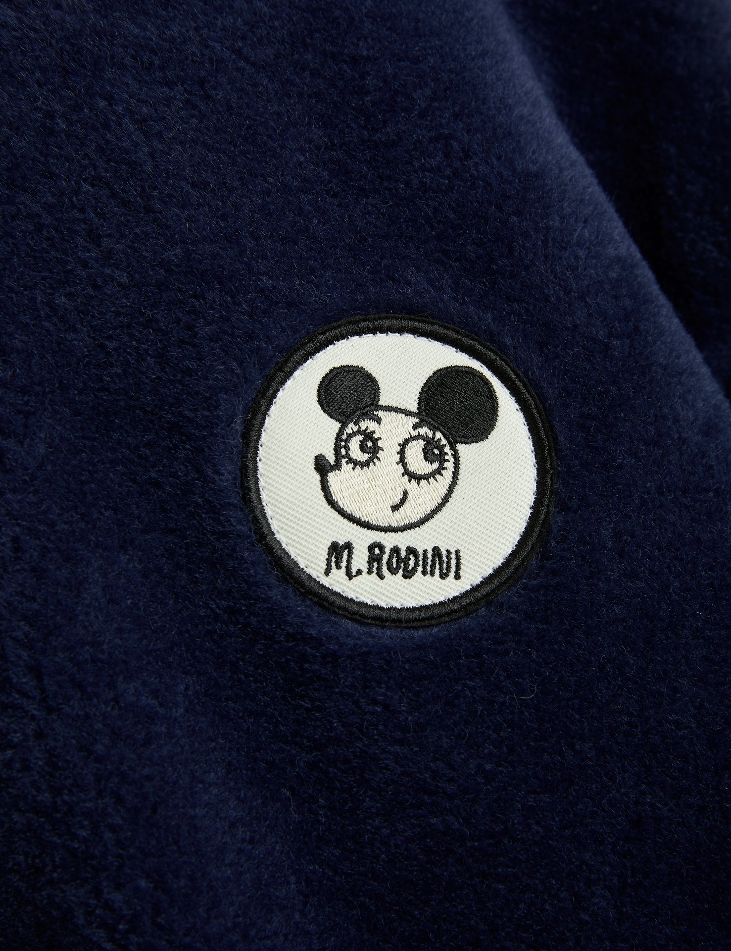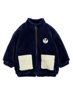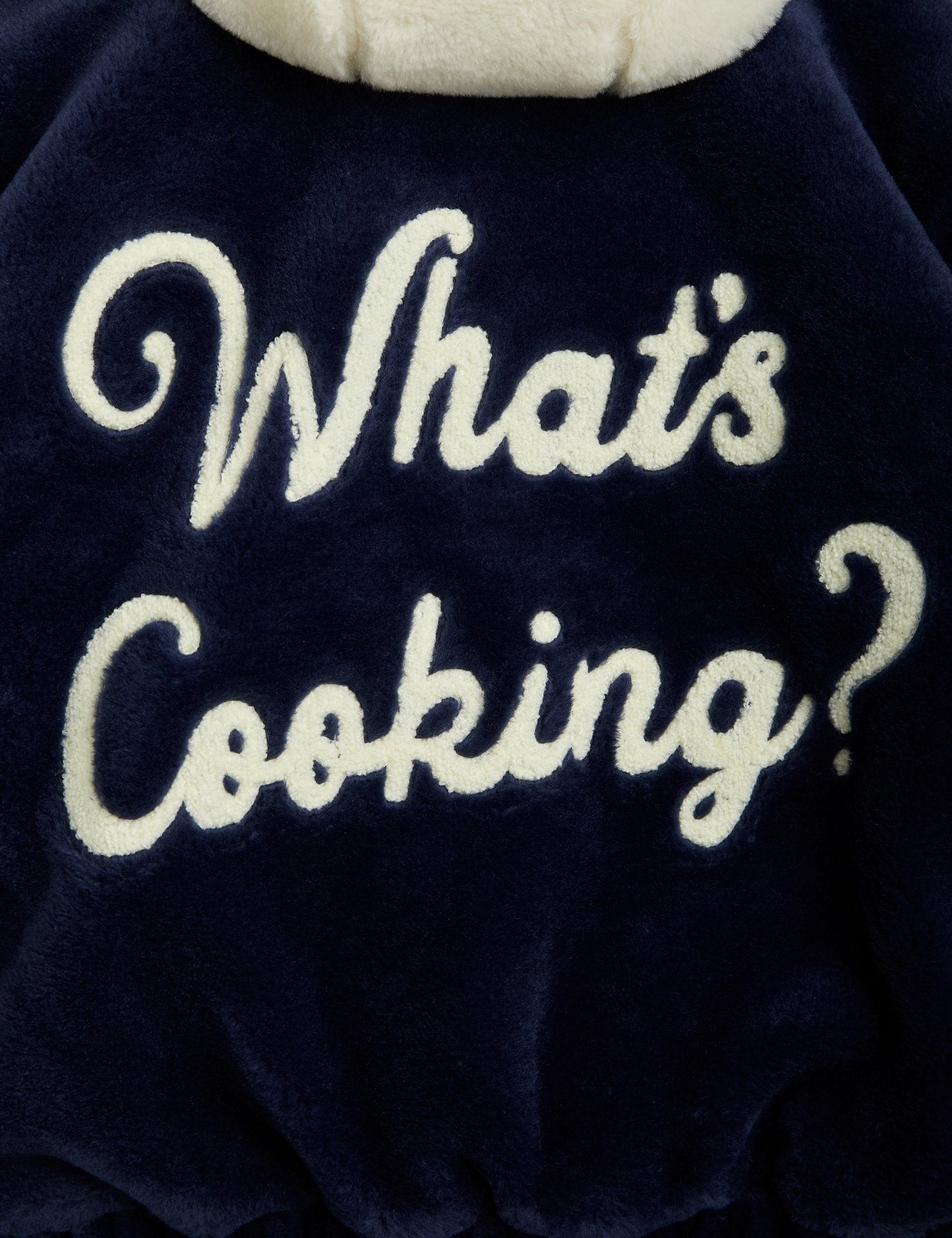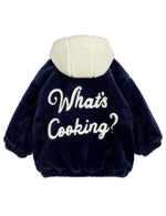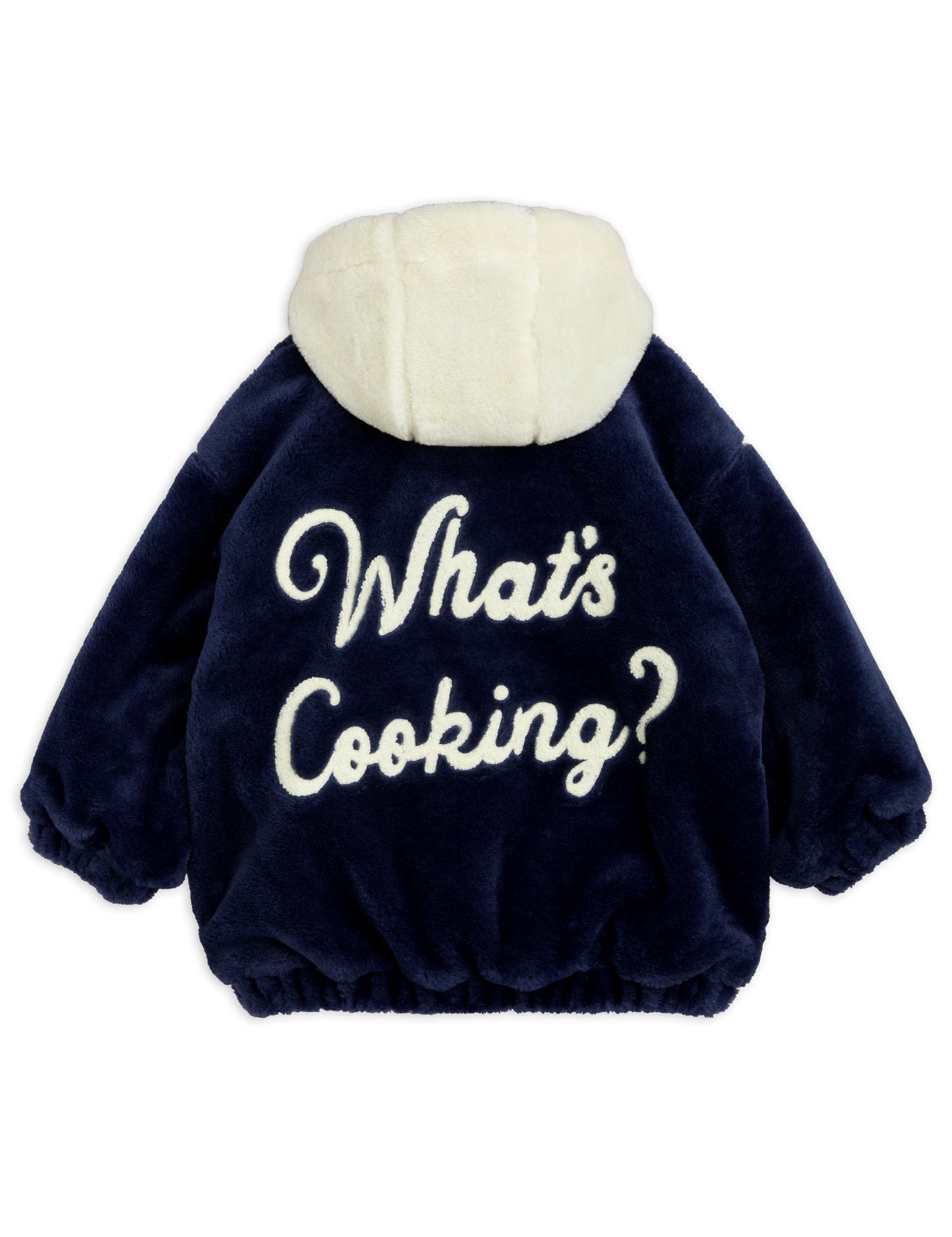 Blue oversized faux fur jacket with an embroidered Ritzratz patch in the front and a large What’s Cooking chenille embroidery in the back, made from 100 % recycled polyester.
