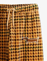 Mini Rodini Velour trousers with an all over Houndstooth pattern and an embroidered Dog patch, made from 100 % GOTS certified organic cotton. Designed with an adjustable drawstring waist.