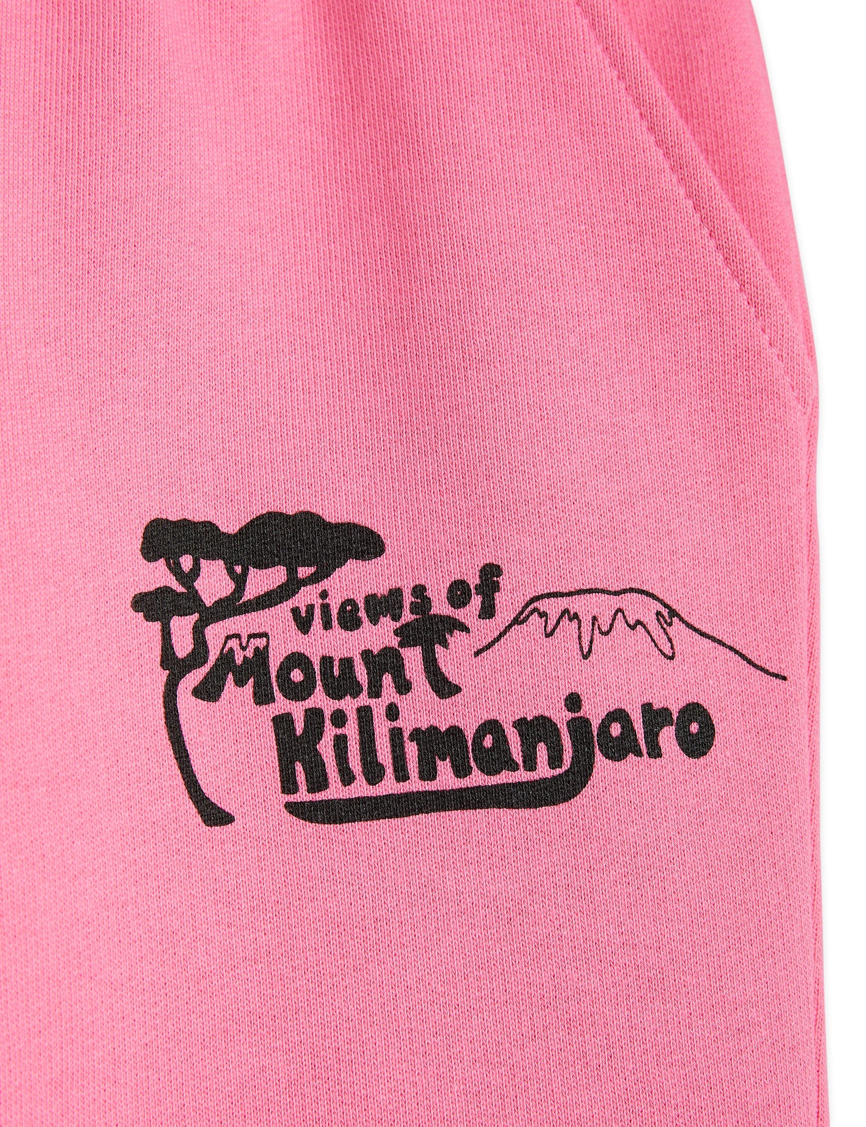 Explore the wilderness or just relax on the couch in these comfortable pink sweatpants featuring a Mt Kilimanjaro print. Made from 100 % GOTS certified organic cotton and designed with an elastic drawstring waistband, two front pockets and ribbed cuffs.