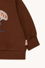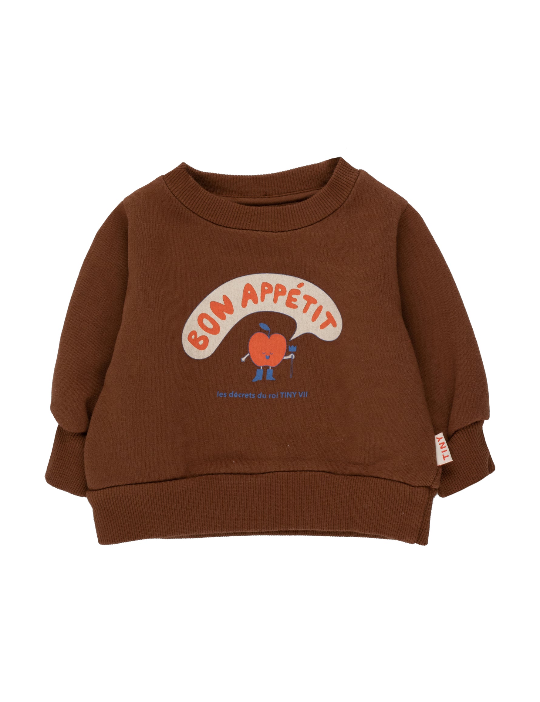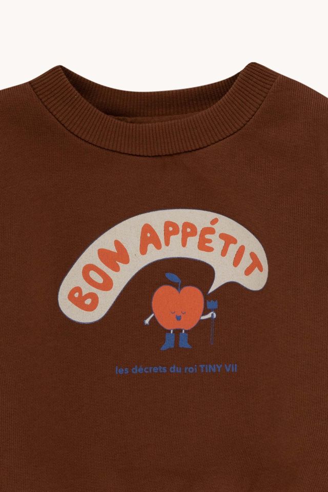 Unit price perBon Appetit print on a chocolate base sweatshirt. It comes with long sleeves, a round neckline and ribbed trim on the neck and hem. Made with GOTS certified organic cotton, to ensure an earth friendly product and to provide maximum comfort.