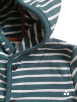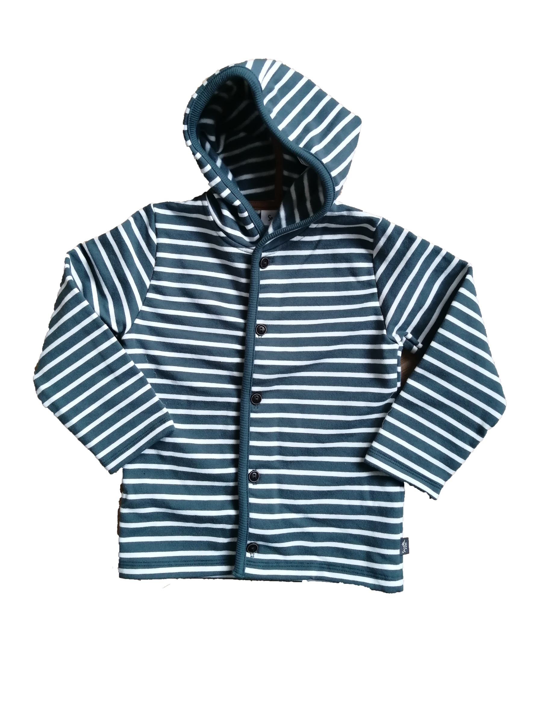 Striped sweat jacket by Sanetta Pure for boys with petrol blue stripes and trendy pointed hood.