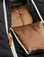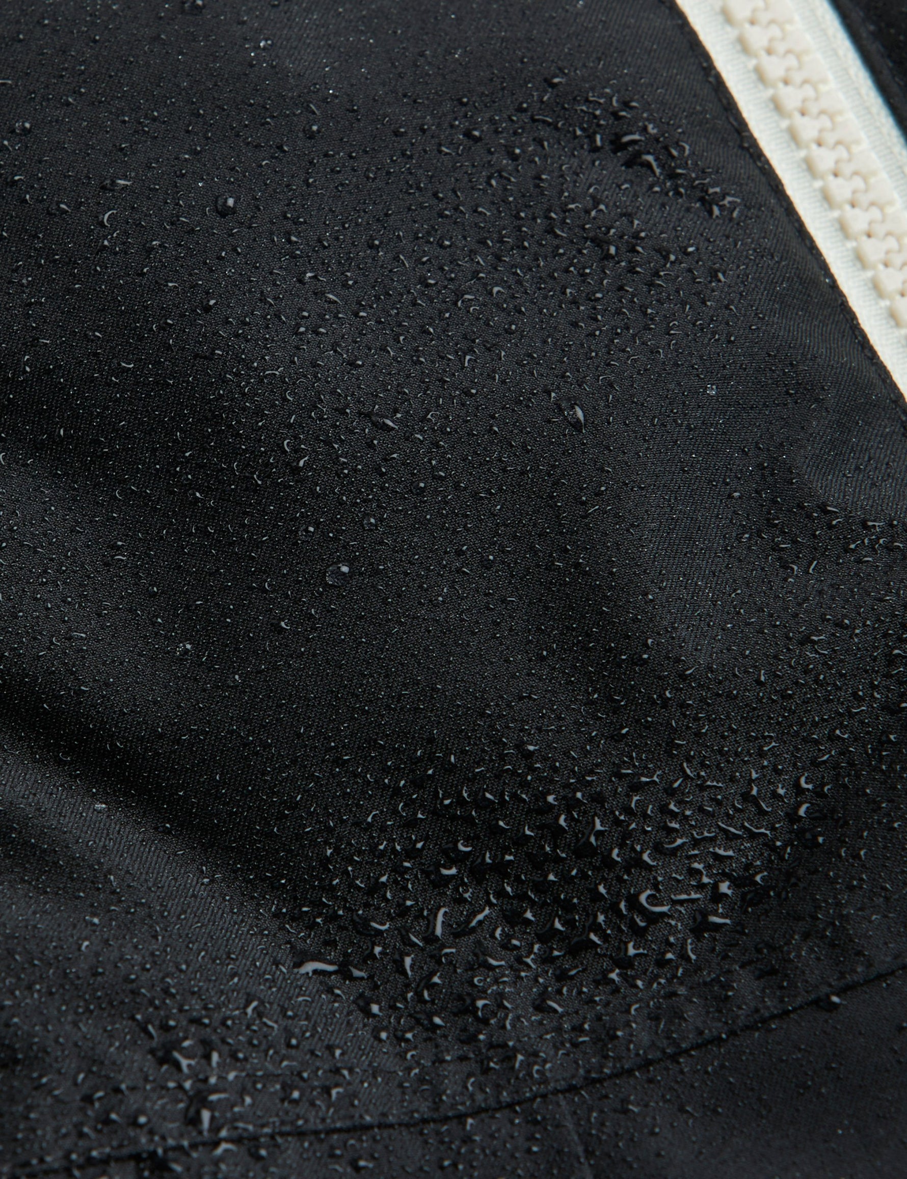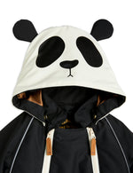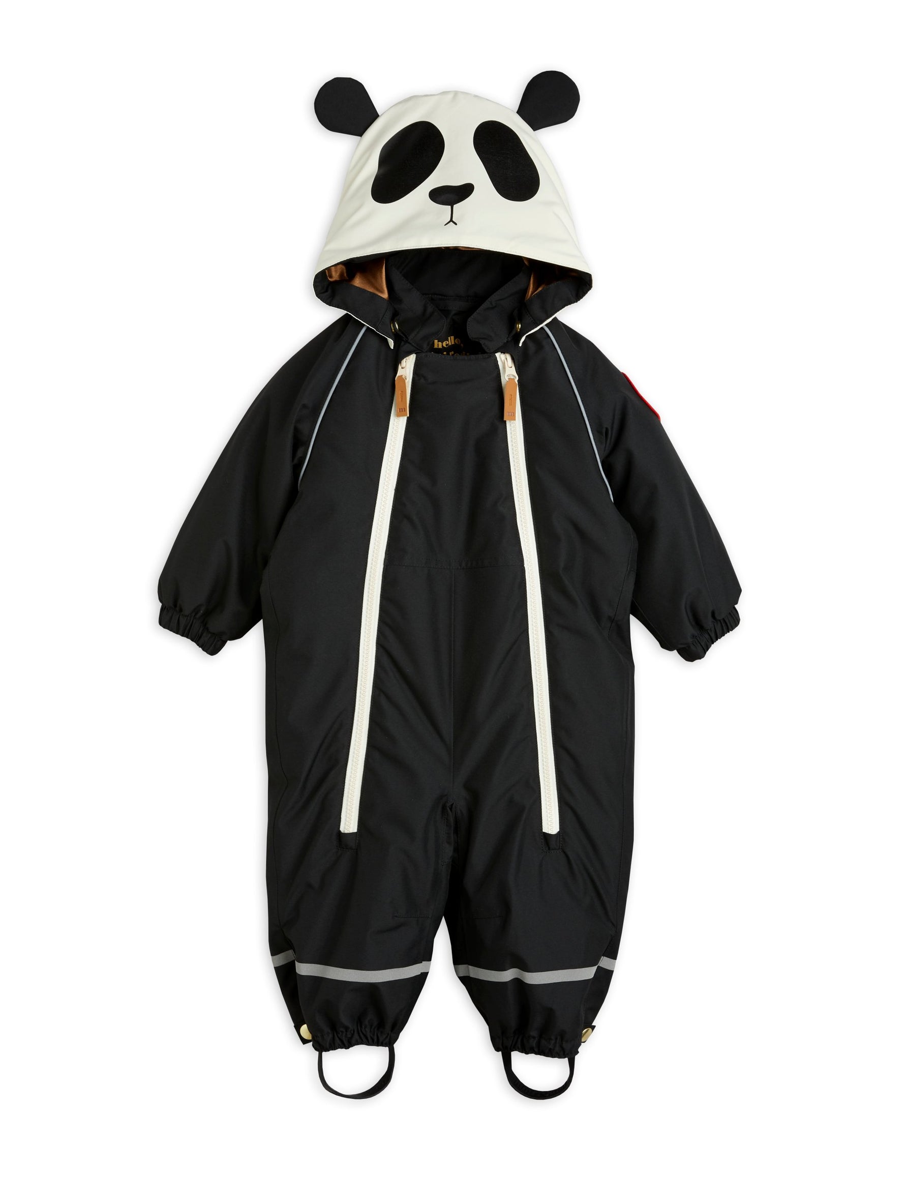 Padded black water- and windproof baby snowsuit with a removable panda-hood, made in 100 % recycled polyester. The snowsuit has pre-shaped legs and raglan sleeves for better movability as well as double zips for easy dressing. The smartly placed reflectors increase visibility when the days get darker. This snowsuit is a returning Mini Rodini classic.