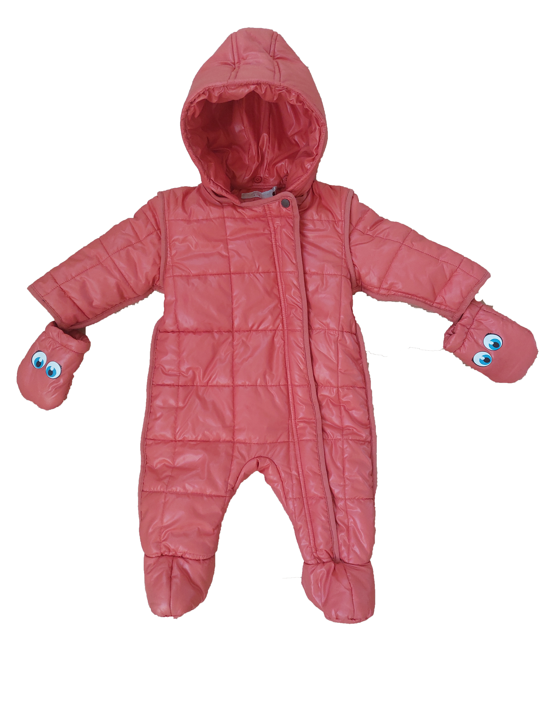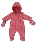 "Salmon coloured overall with gloves and a hoodie for 3 months old. With a handy zipper from neck to toe - ideal for diaper changes.