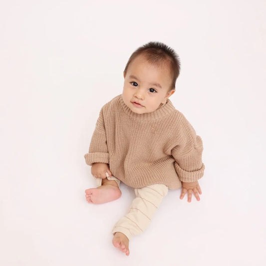 Offer your kid the joy of playful movement with our neutral color loose fit sweaters. They are all about softness and comfort. YoungYarn baby sweater's relaxed style and unique neutral shade make pairing with different tops a breeze. Match them with our neutral baby pants, or mix with bottoms like our Pine Stripes leggings or undyed leggings with Turkish fruit or vegetable designs. It's all about crafting your kid's signature look!