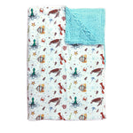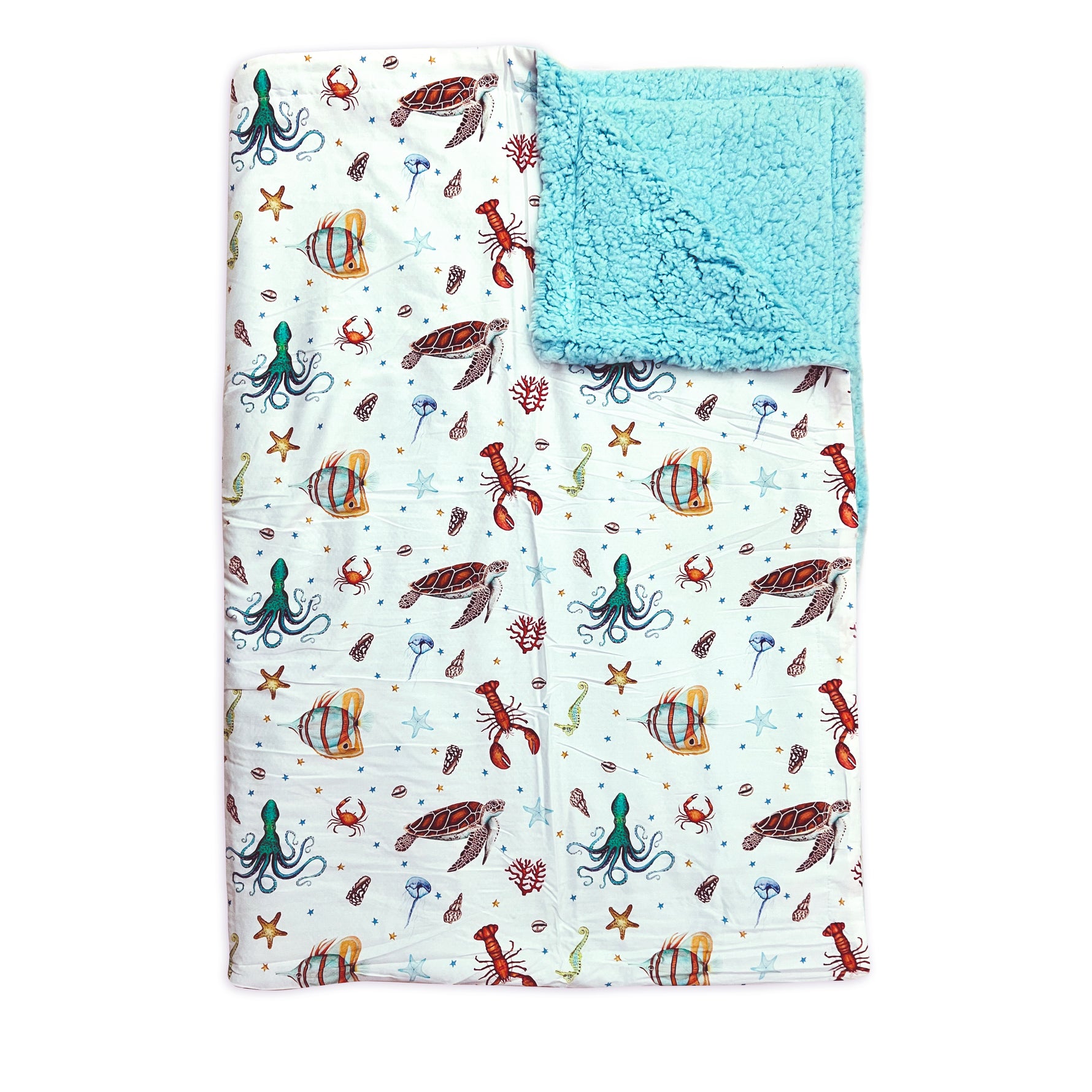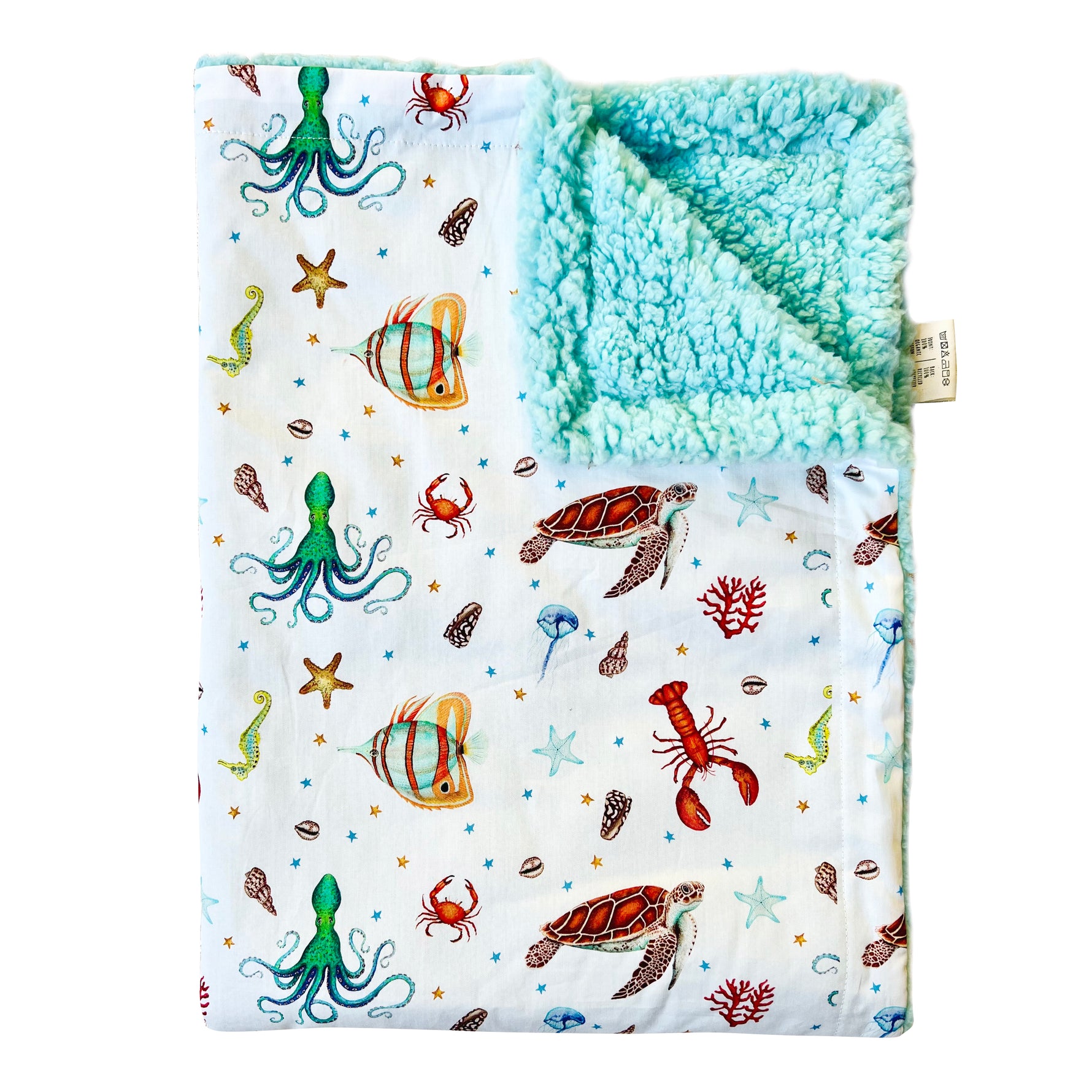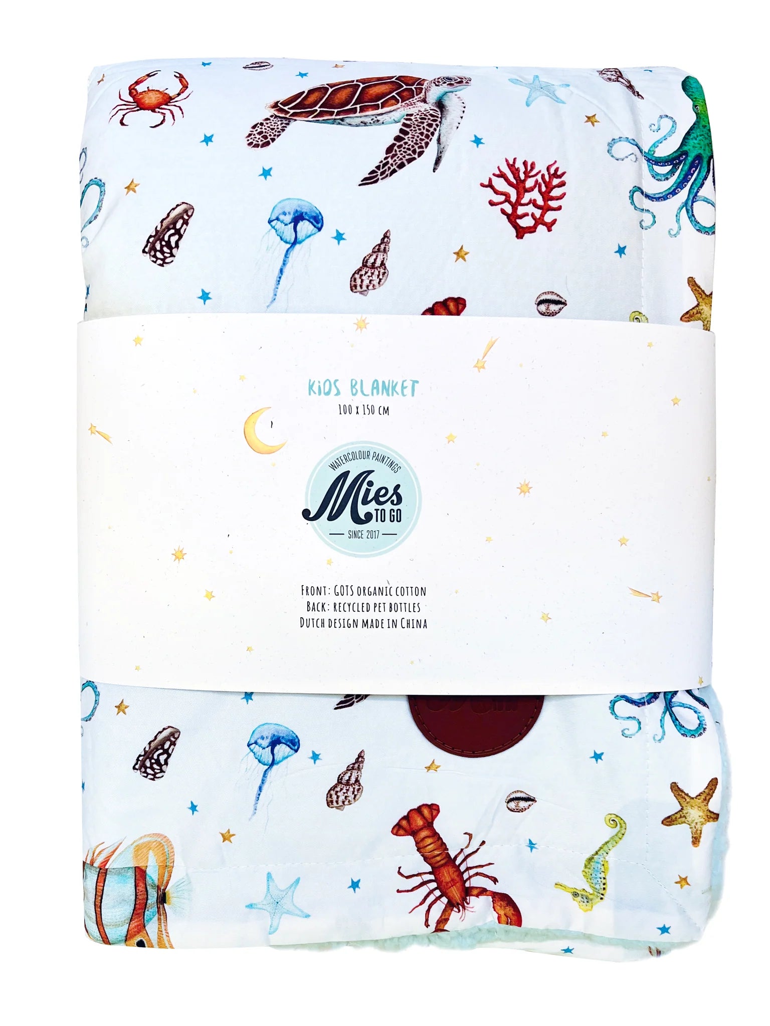 Unit price perLovely soft and warm baby/kids blanket with ocean decorations, such as sea turtles, octopuses, fish and coral. The print is hand painted by Mies with watercolor paint and is beautifully printed on the textile.