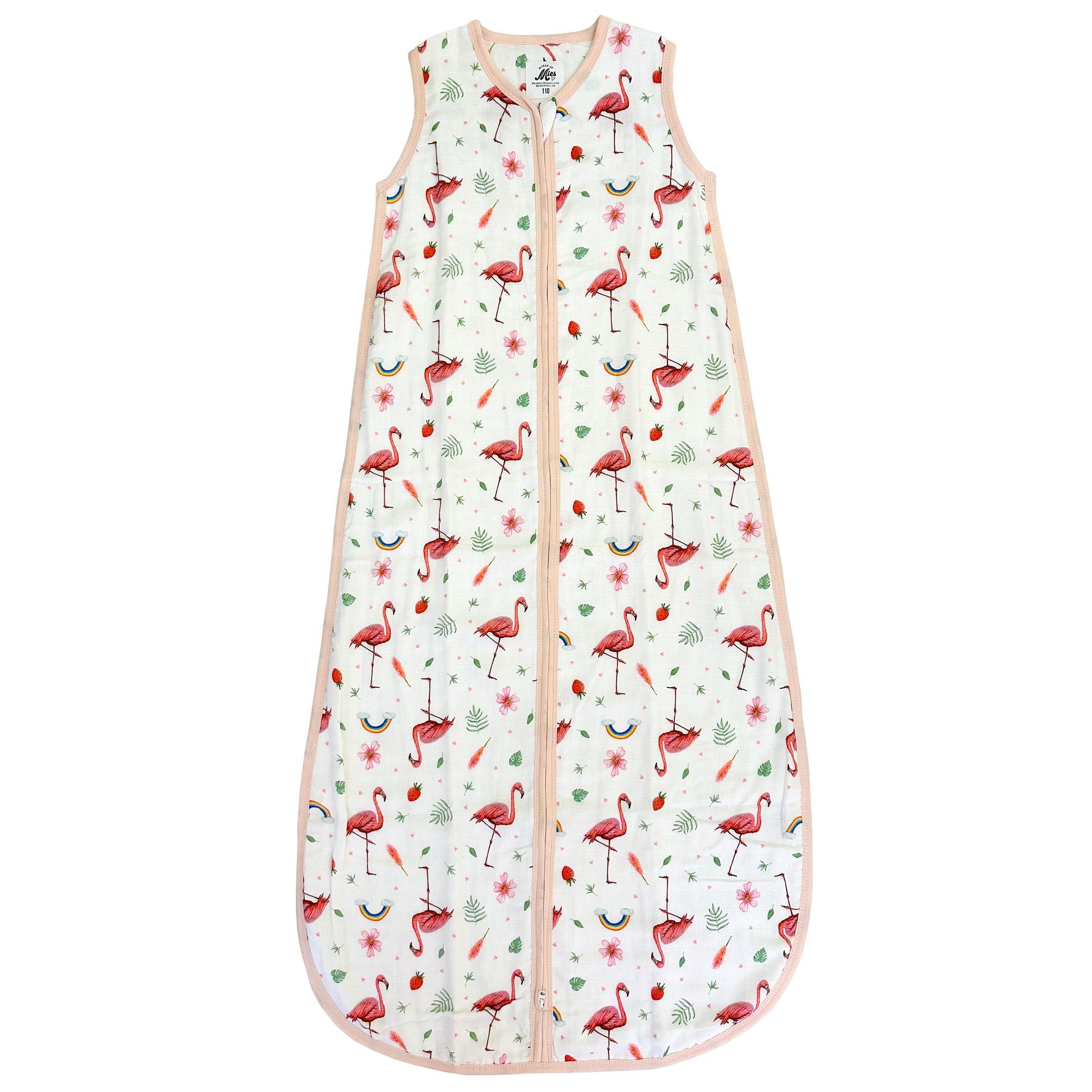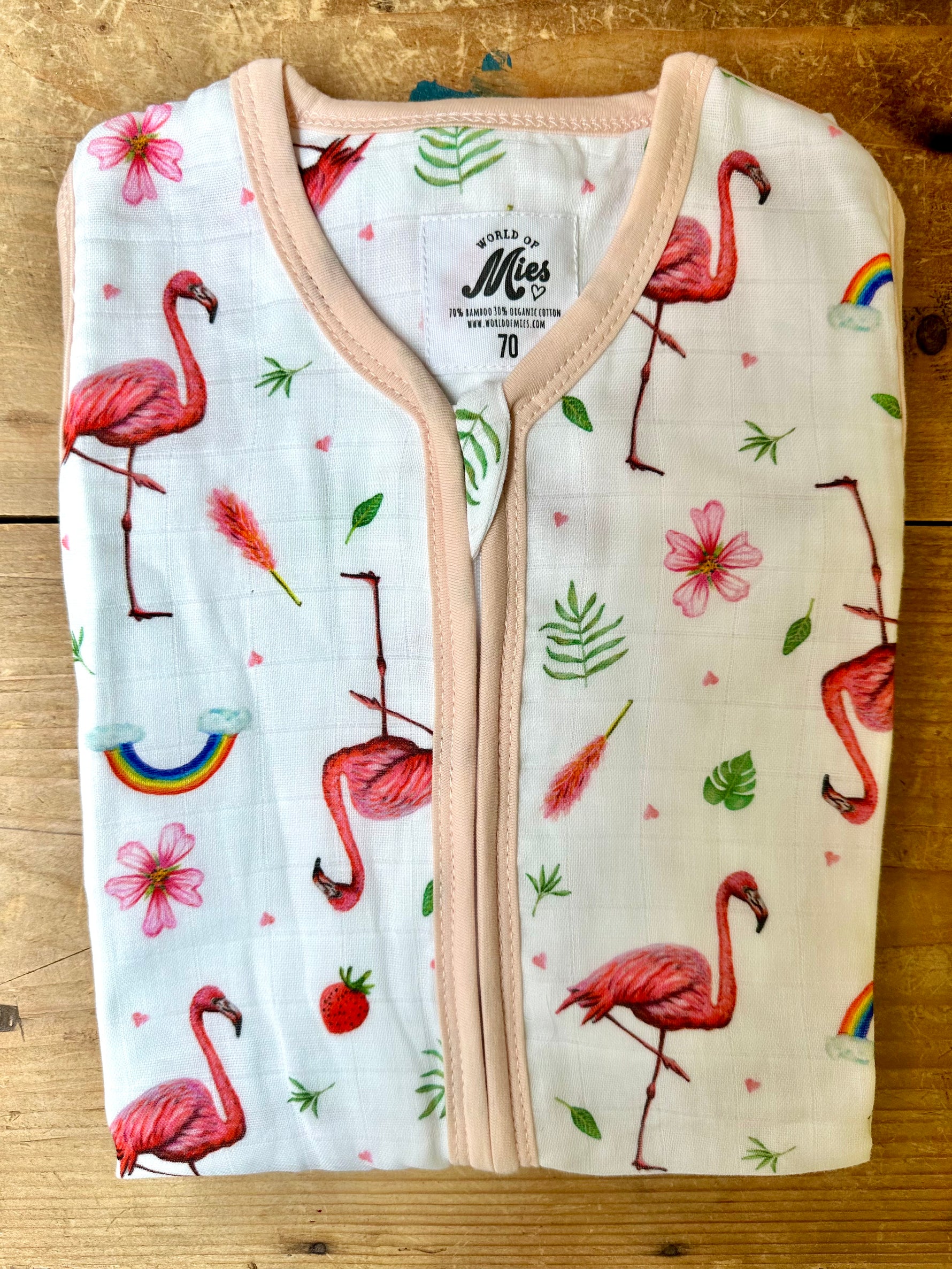 Super soft baby sleeping bag of hydrophilic fabric with cute flamingo pattern. The print is painted by Mies with watercolour. Very nice to give as a maternity present or birthday present. Or to give yourself something unique for your own baby outfit. The sleeping bag is nice and airy, ideal for the warmer summer nights.