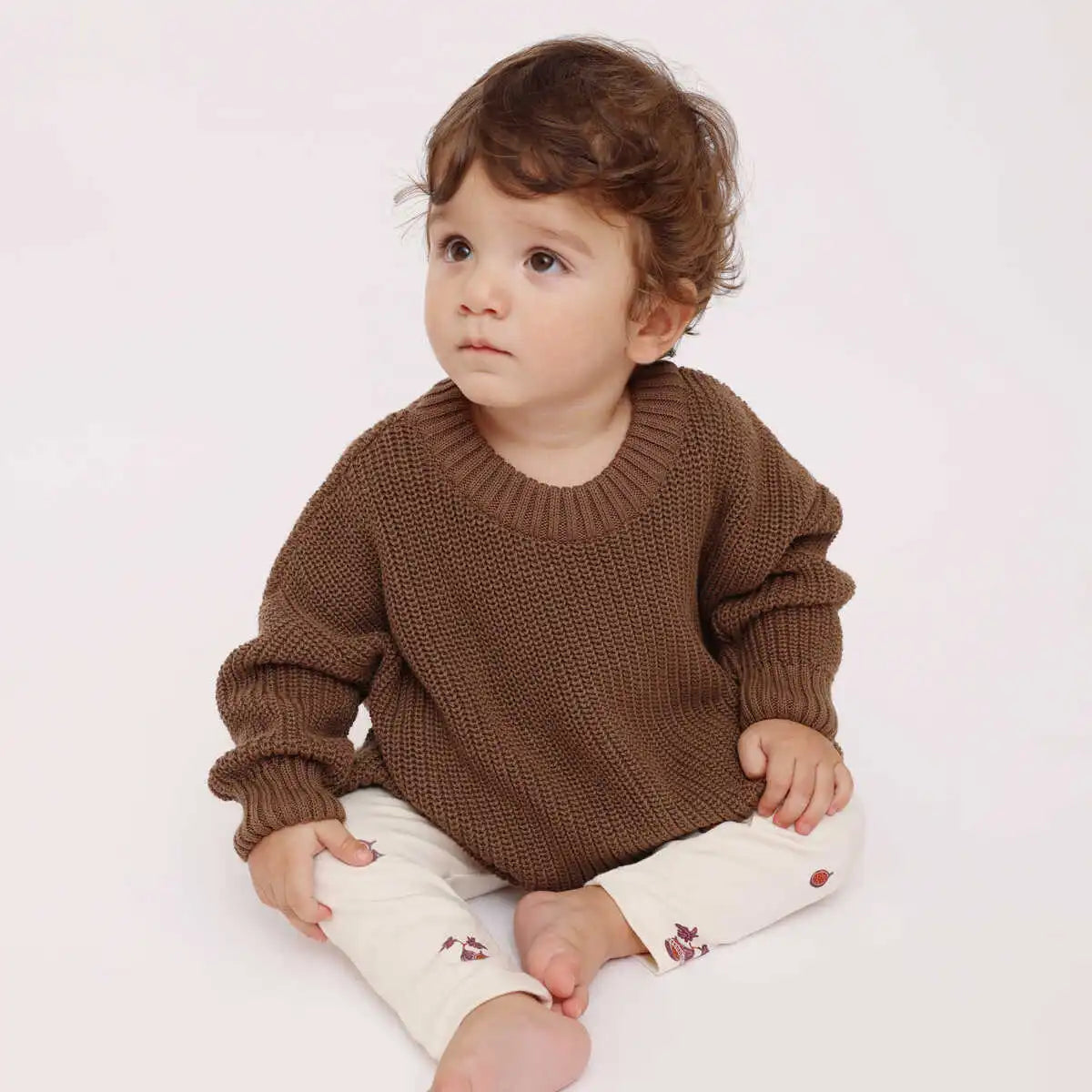 Made for longevity and adaptability, our Knitwear Collection grows with your child, ensuring prolonged comfort and wear. Each piece is crafted from 100% GOTS-certified organic cotton, gentle on your child’s skin and free from harmful chemicals. This chocolate color knitwear piece complement various outfits, making it versatile additions to your child’s wardrobe.