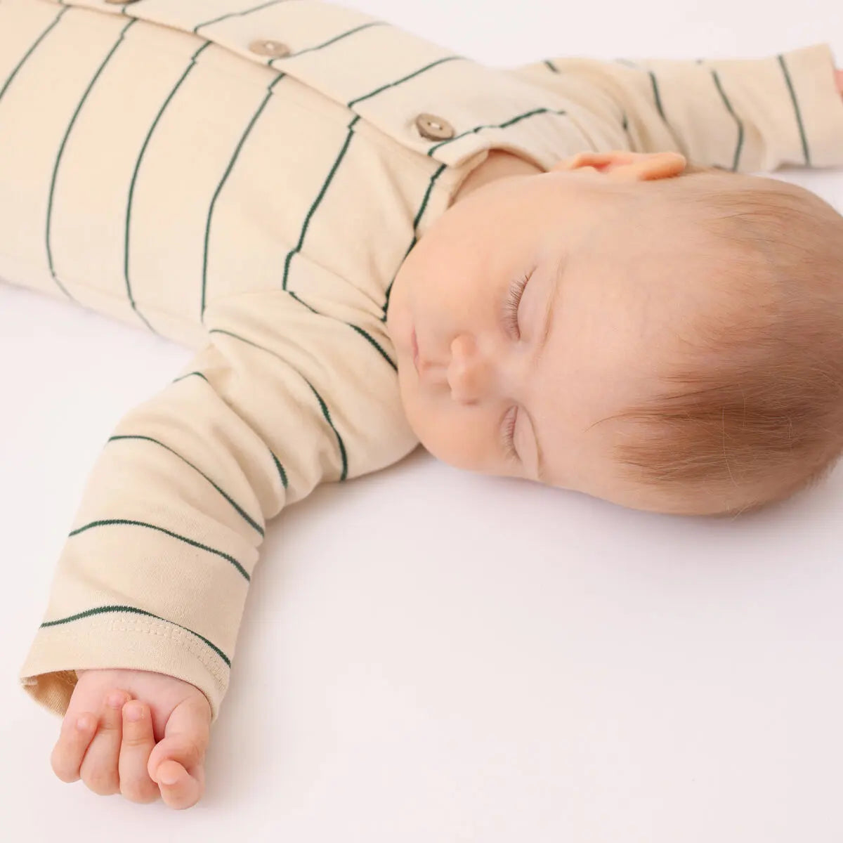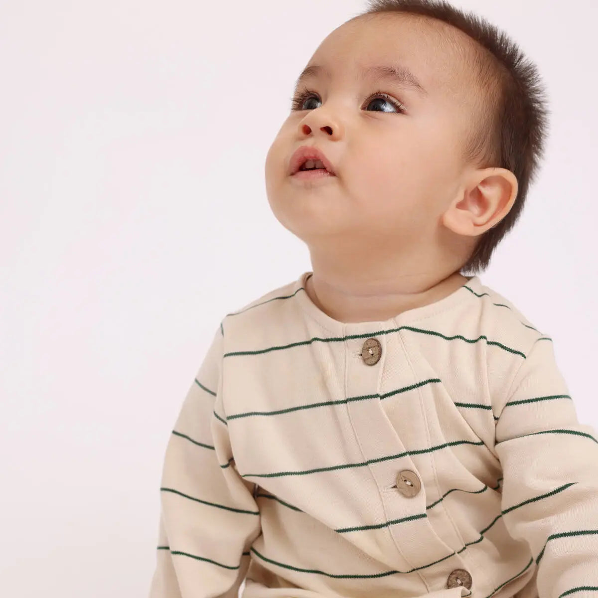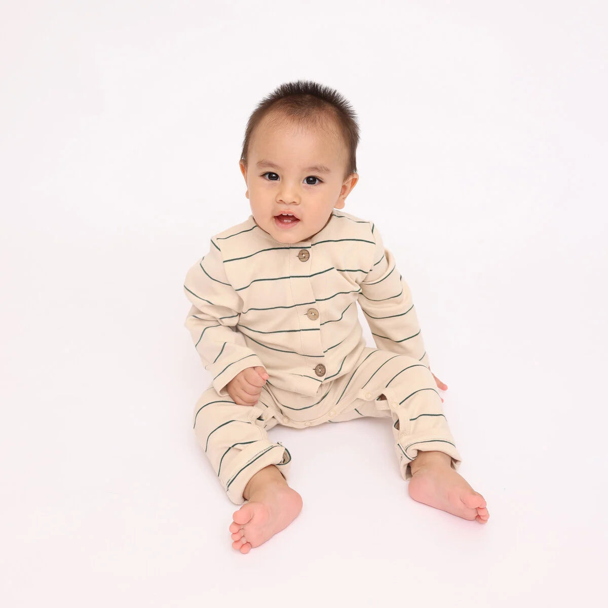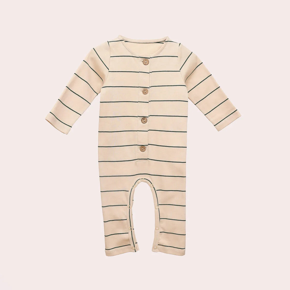 Our organic cotton one-piece in pine stripes is a sensible, eco-friendly choice for your baby. Made with organic cotton, this one-piece is soft and kind for your baby’s skin. The pine stripes design is timeless and classic. Designed with both baby and parent in mind, it includes snap buttons for hassle-free diaper changes, and the coconut buttons and pocket on the back are practical yet stylish additions. It’s suitable for playtime and nap time, keeping your baby comfortable throughout the day.