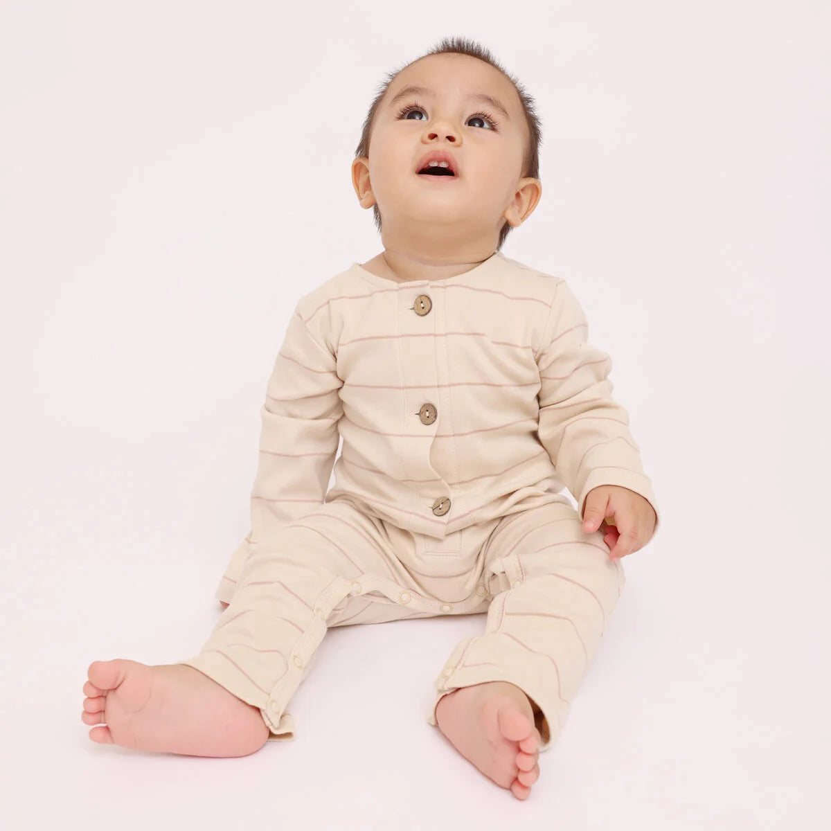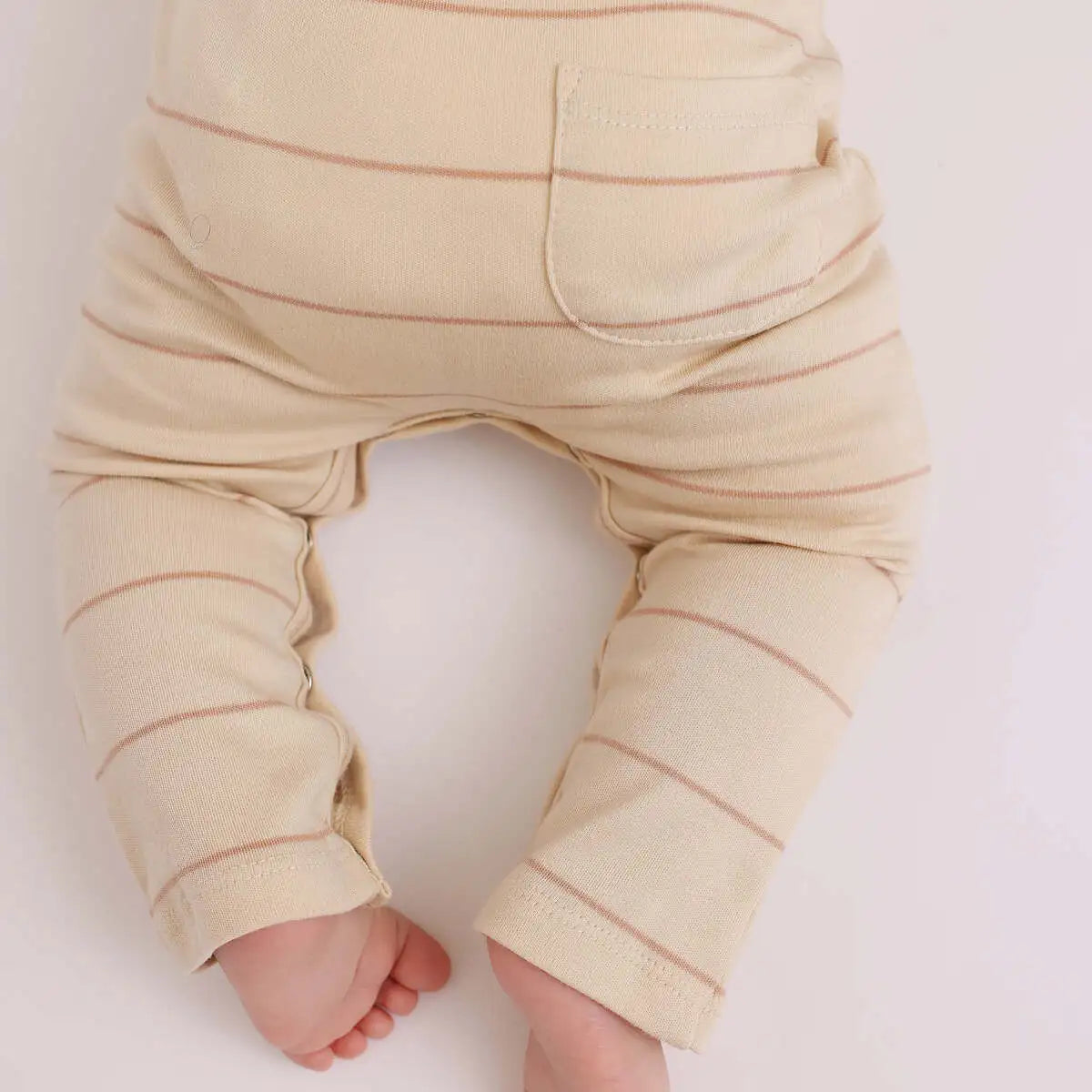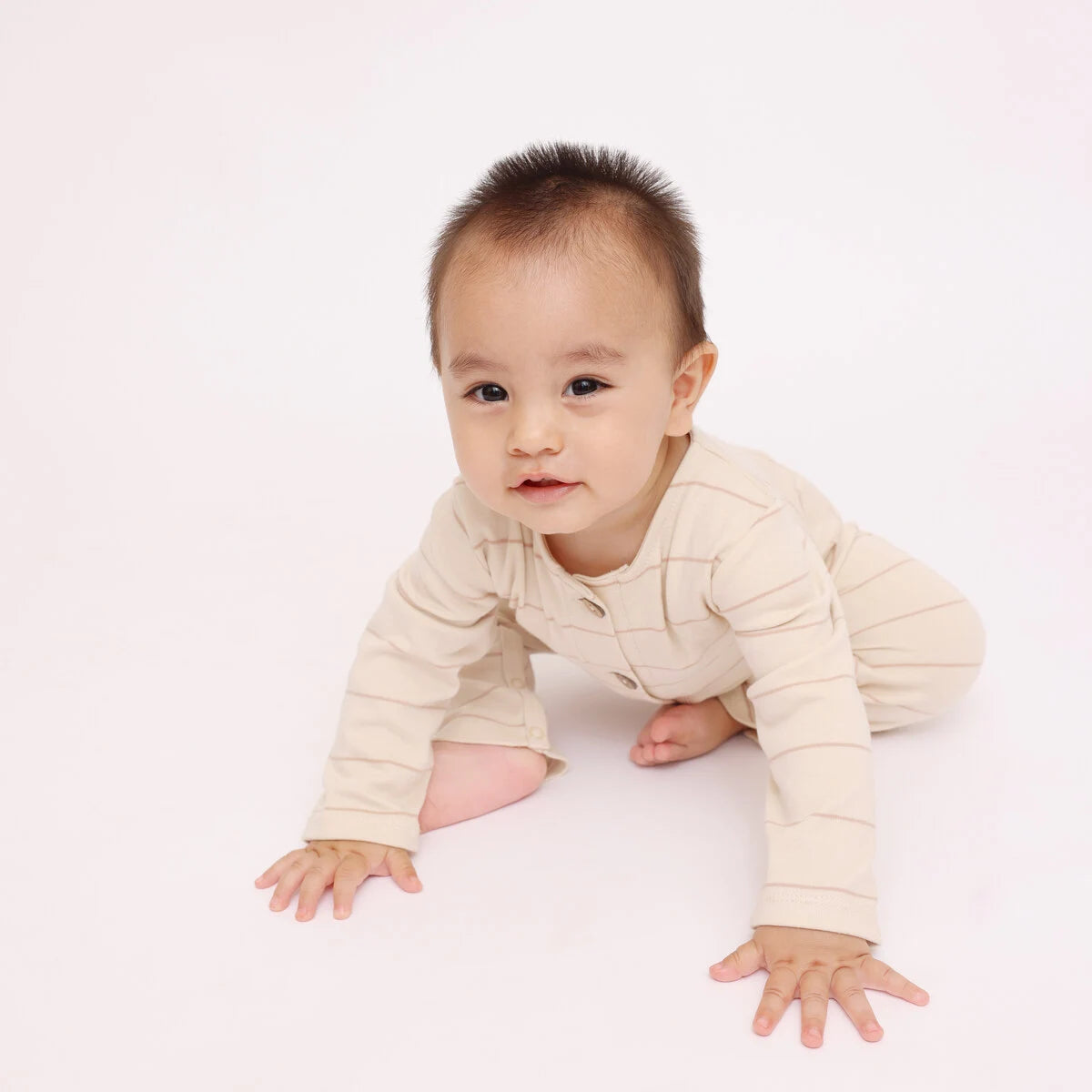 Our organic cotton one-piece in taupe stripes is a sensible, eco-friendly choice for your baby. Made with organic cotton, this one-piece is soft and kind for your baby’s skin. The taupe stripes design is timeless and classic. Designed with both baby and parent in mind, it includes snap buttons for hassle-free diaper changes, and the coconut buttons and pocket on the back are practical yet stylish additions. It’s suitable for playtime and nap time, keeping your baby comfortable throughout the day.
