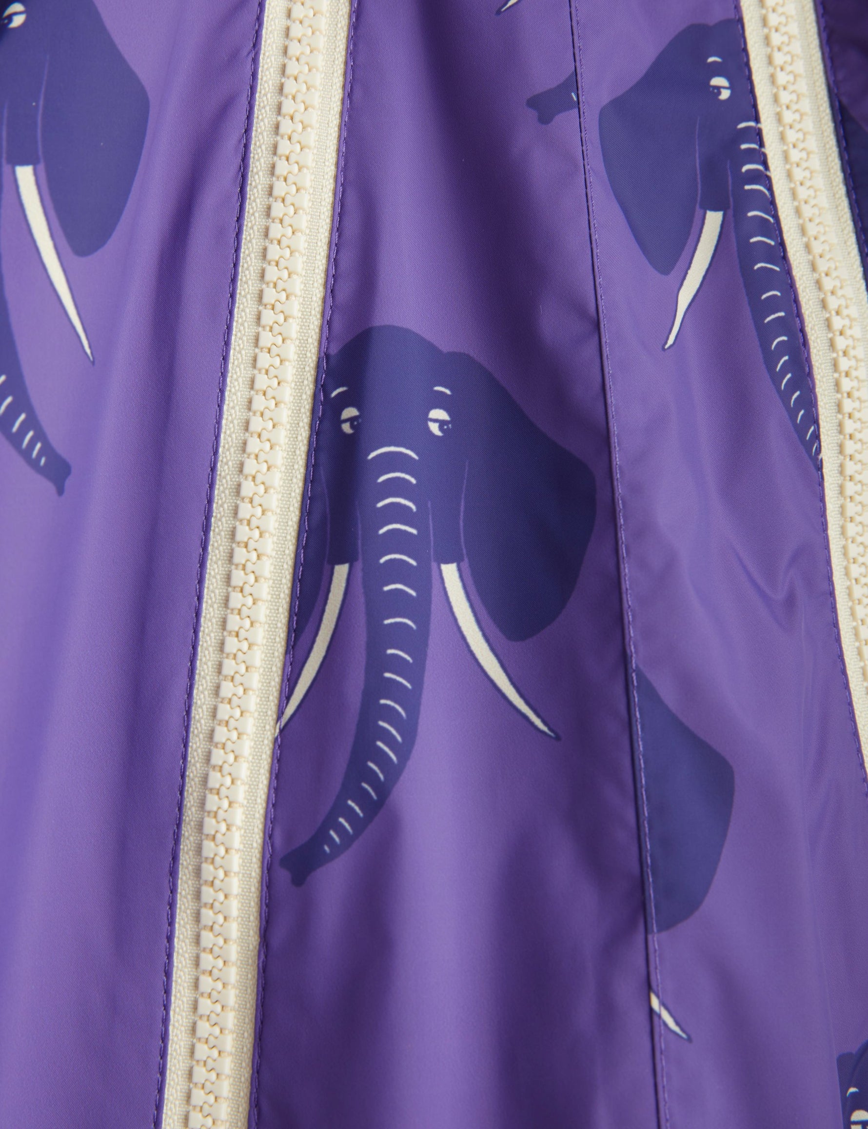Einzelpreis proPraktischer lila Überziehoverall mit Elefanten-Allover-Print aus 100 % recyceltem Polyester. Die Jacke hat vollständig verschweißte Nähte und ist dank der giftfreien BIONIC-FINISH® ECO-Beschichtung wind- und wasserdicht. Die Kapuze schützt vor kaltem Wind oder kann komplett entfernt werden, um dem Überziehoverall einen neuen, stylischen Look zu verleihen. Der Doppelreißverschluss vorne, die innenliegende Reißverschlussabdeckung für zusätzlichen Windschutz und die gerippten Bündchen runden das Design ab. Auf der Rückseite befindet sich ein reflektierender Aufdruck für bessere Sichtbarkeit im Dunkeln. Funktional und modisch!