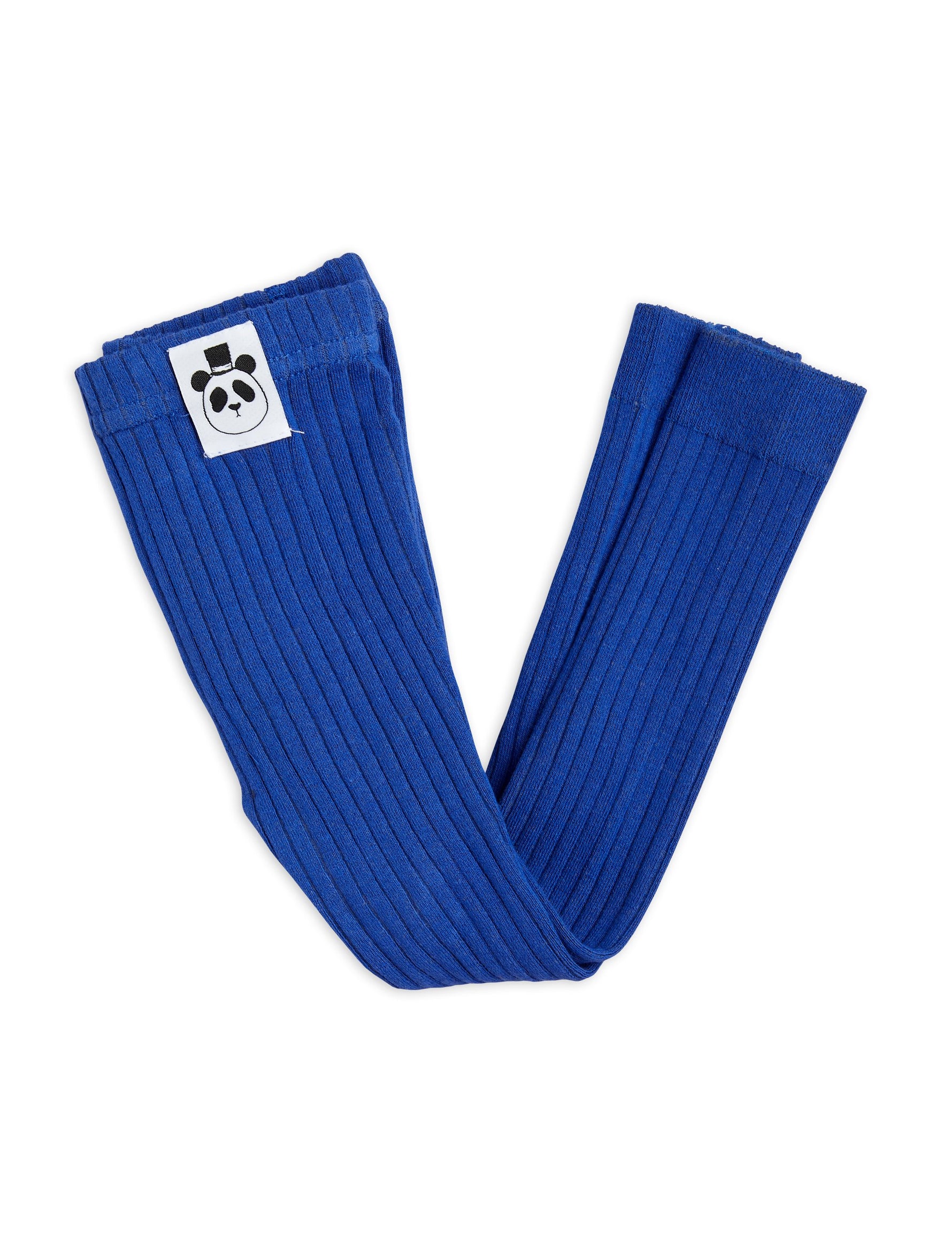 Gerippte Strumpfhose in Lila mit aufgenähtem Mini Rodini Panda-Logo am Bund. Hergestellt aus einer Mischung aus GOTS-zertifizierter Bio-Baumwolle und Polyamid mit Stretch für zusätzlichen Komfort.