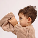 Made for longevity and adaptability, our Knitwear Collection is crafted from 100% GOTS-certified organic cotton, gentle on your child’s skin and free from harmful chemicals. This taupe knitted beanie complement various outfits, making it versatile additions to your child’s wardrobe.