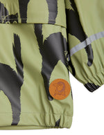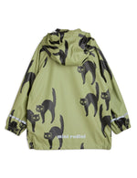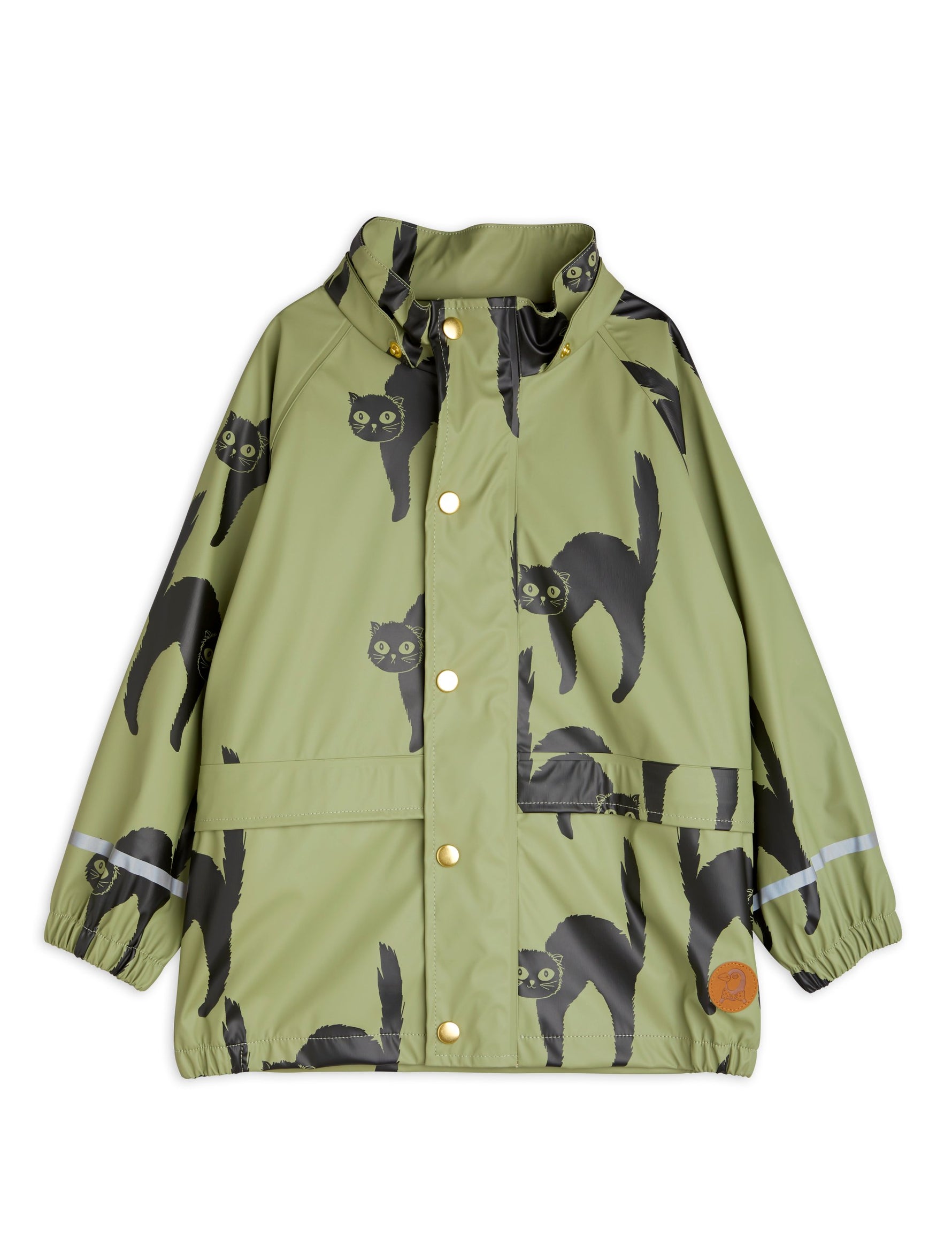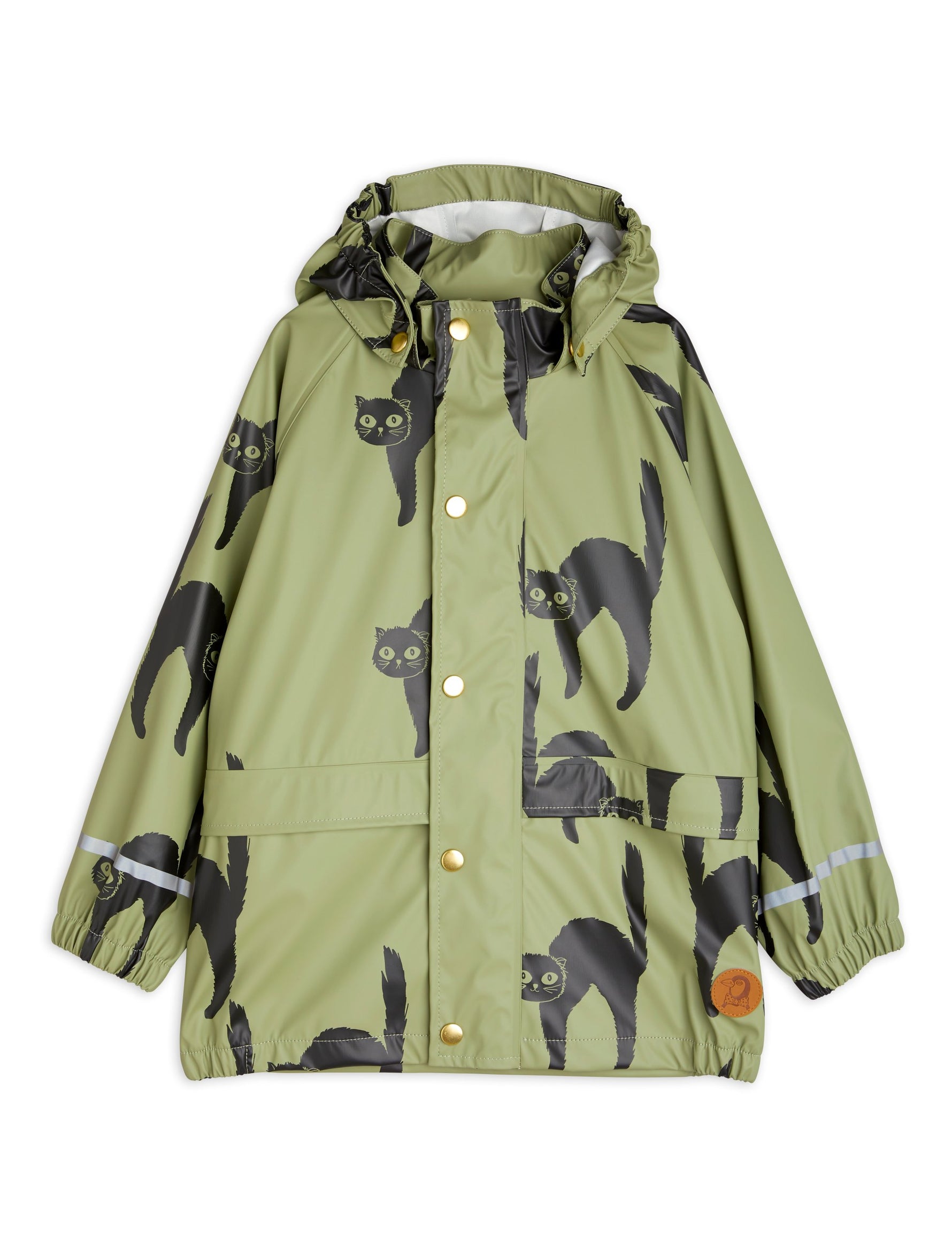 Green rain jacket featuring an all-over Catz print. Made from recycled polyester and PU (polyurethane) – a durable material offering stretch in all directions. The jacket has sealed seams and is waterproof with 10 000 mm water columns. The jacket has a detachable hood, a zip front with a buttoned placket, and elasticated cuffs and hem. The reflective prints on the sleeves and at the back increase visibility in the dark. Combine it with any of our fleece jackets when the temperature drops.