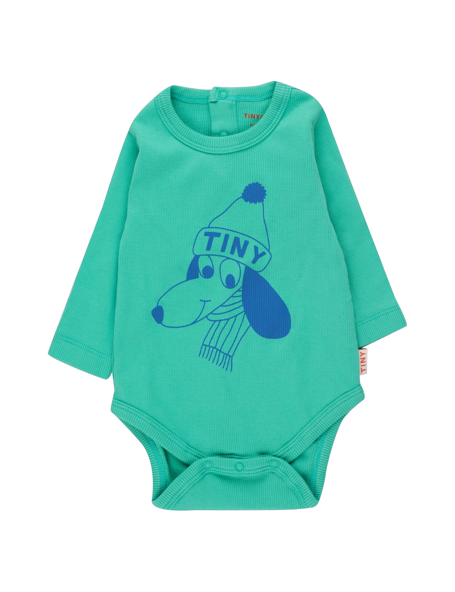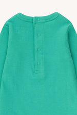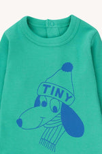 Tiny Dog print on a emerald green base body. It comes with a round neckline, long sleeves. It has a half opening in the back neck and an opening at the crotch with snap buttons for easy dressing and diaper changes.
