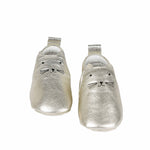 Gold leather cat slippers. At Emile & Ida, we don't put shoes on babies, we dress up their feet. Charming gold leather slippers, fully lined in leather, supple, with elastic under the tongue and a pull tab at the back to make them easy to put on. We love the black muzzle embroidered on the instep and the little pointed ears.