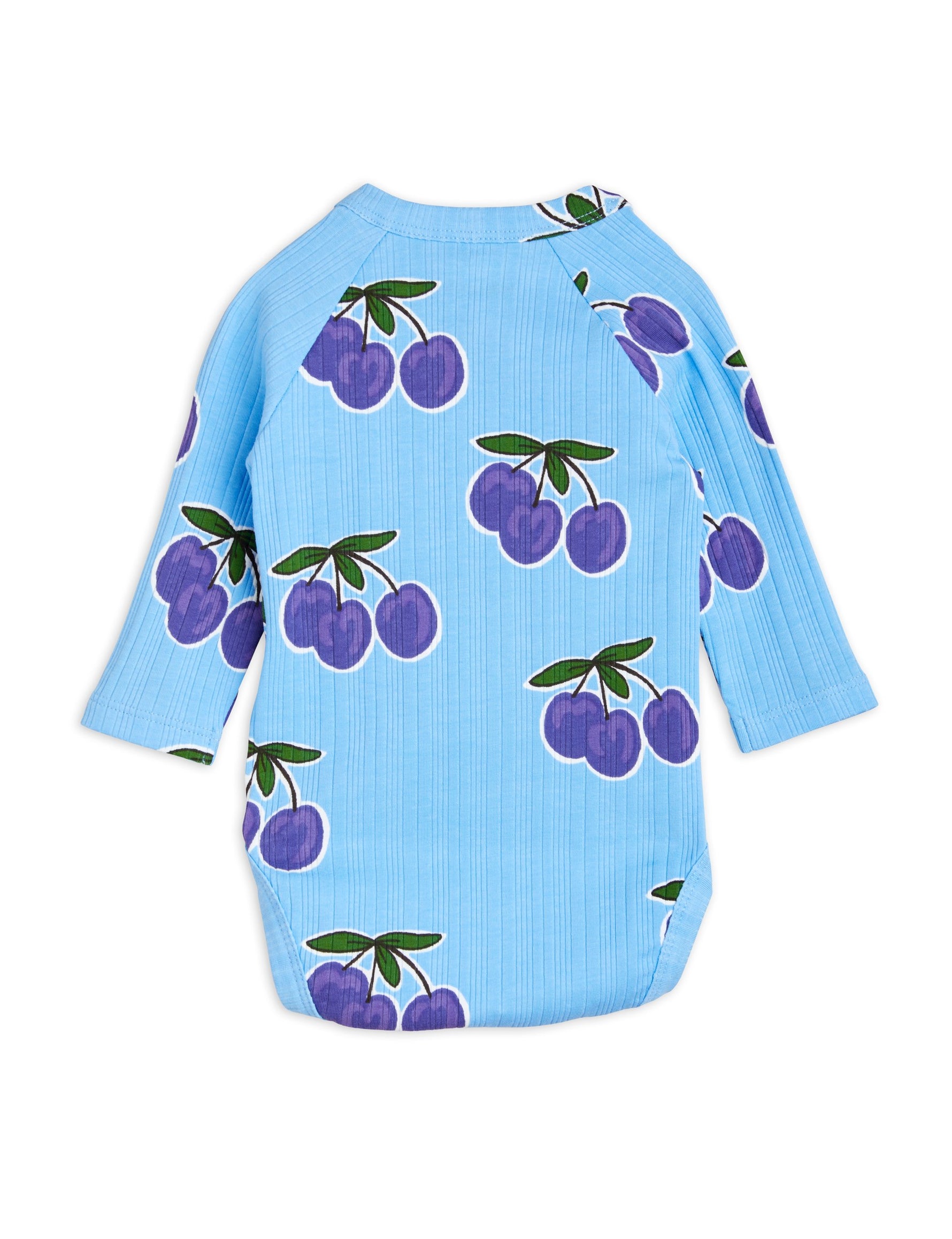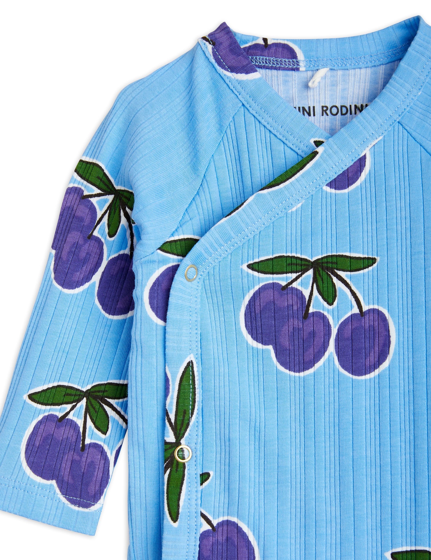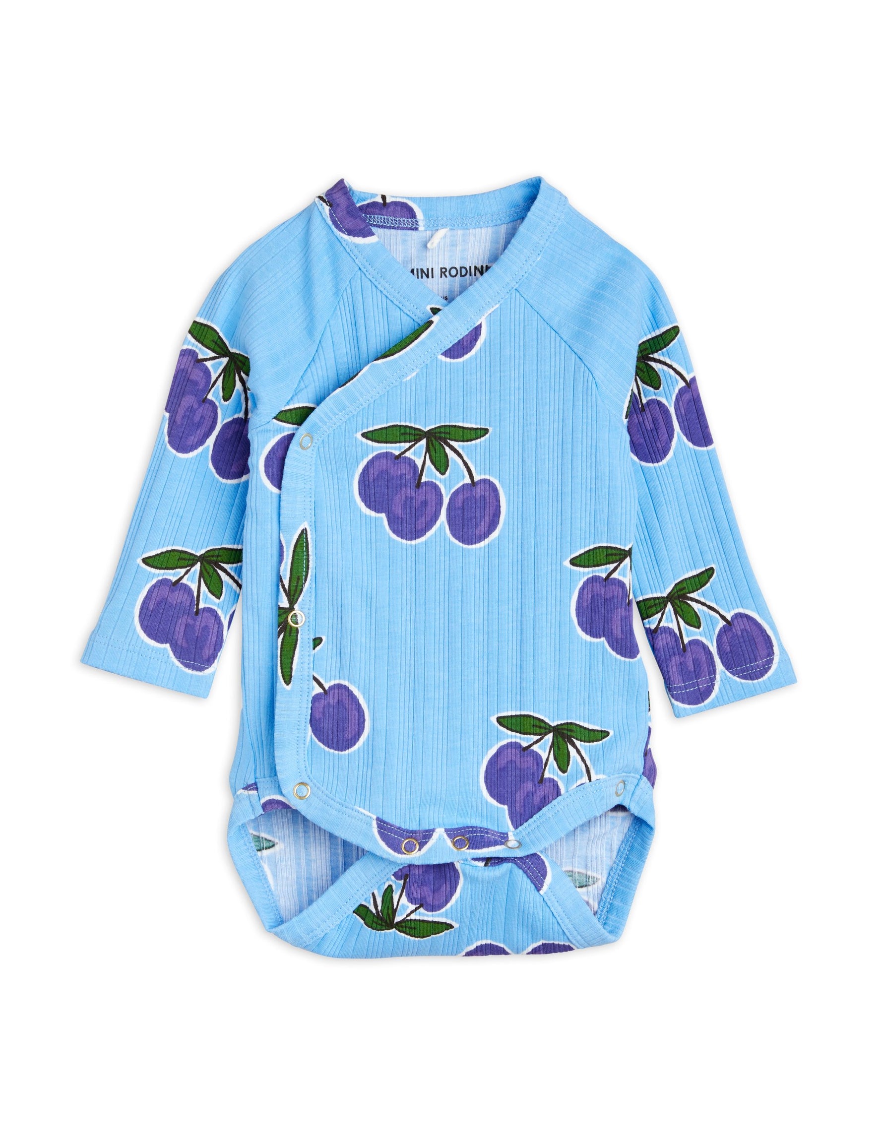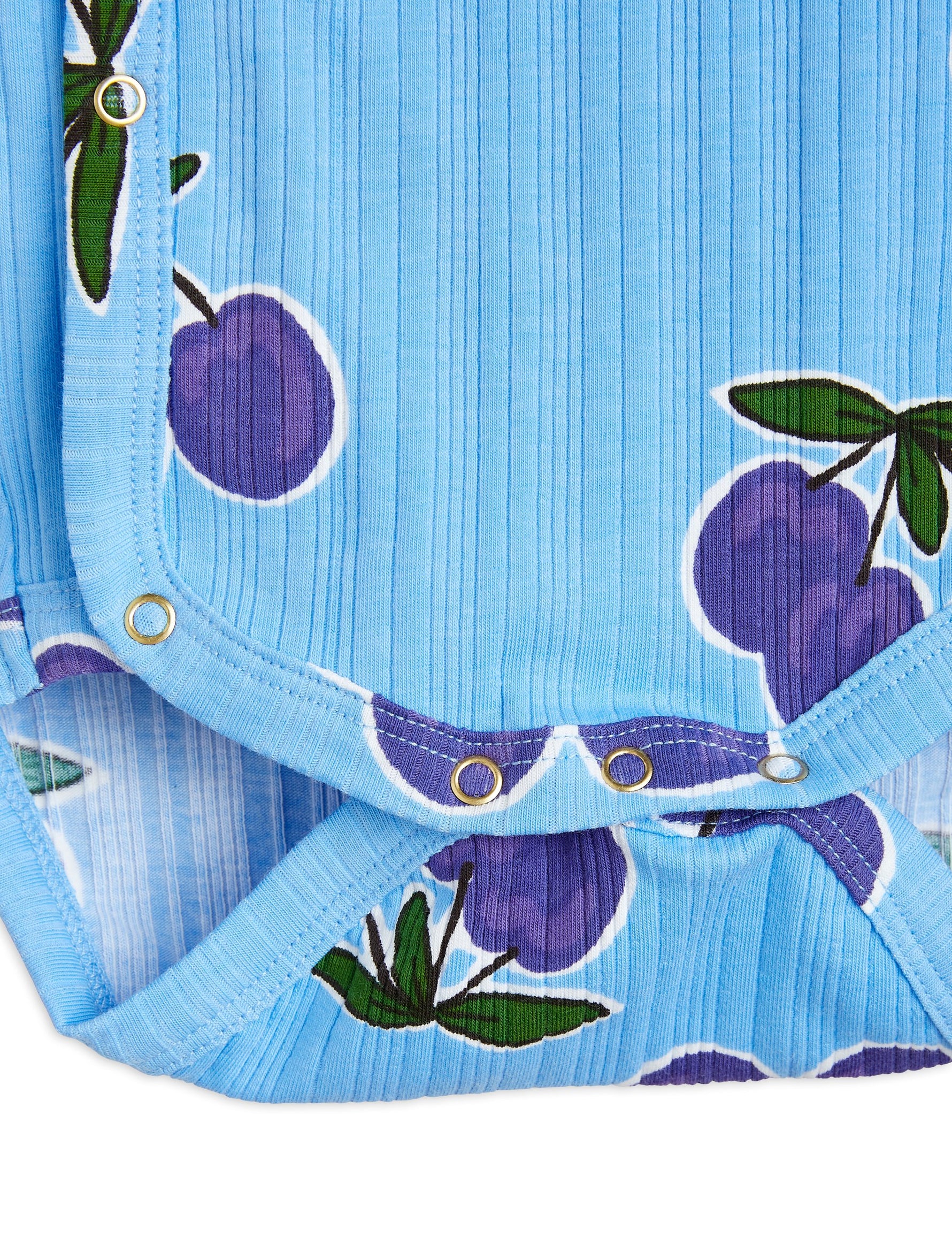Blue ribbed wrap body for newborns with all over Plum print made from GOTS certified organic cotton with stretch.