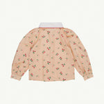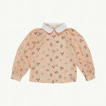 Regular fit organic cotton blouse with a soft cherry and flower print with a button closure and white collar with red binding.