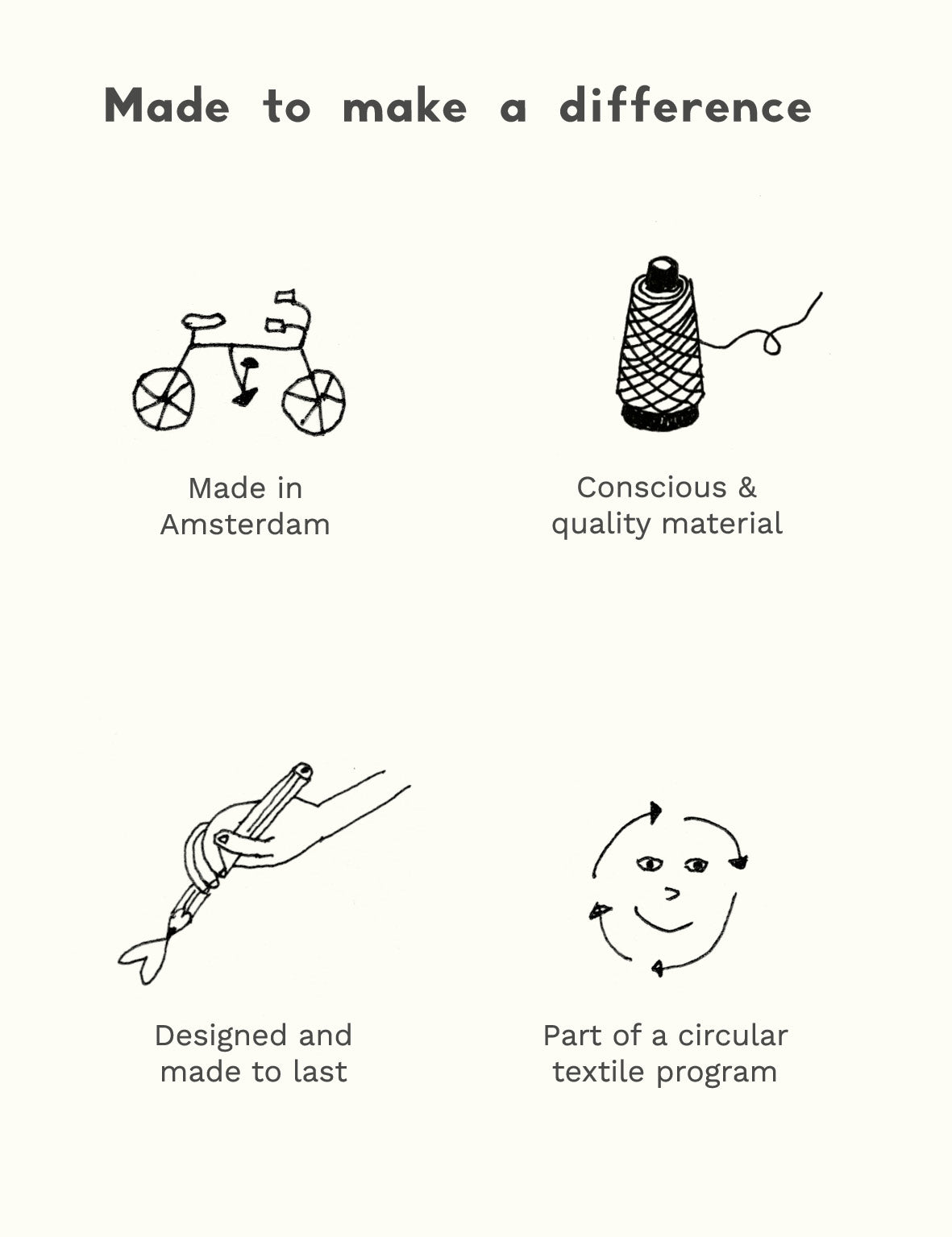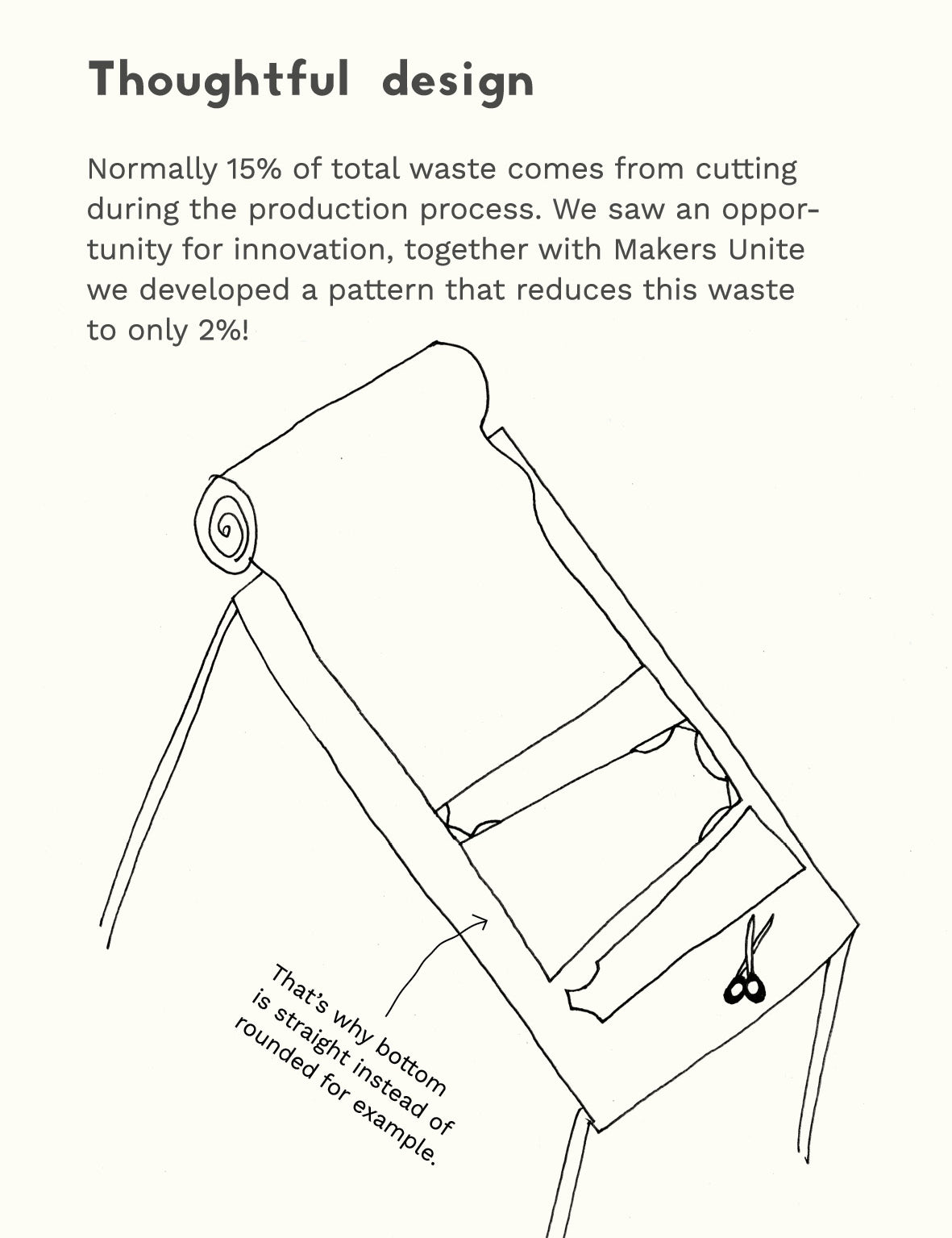 Thoughtful design Normally 15% of total waste comes from cutting during the production process. We saw an opportunity for innovation, together with Makers Unite we developed a pattern that reduces this waste to only 2%!