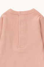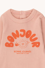 Bonjour print on a powder pink base body. It comes with a round neckline, long sleeves. It has a half opening in the back neck and an opening at the crotch with snap buttons for easy dressing and diaper changes.