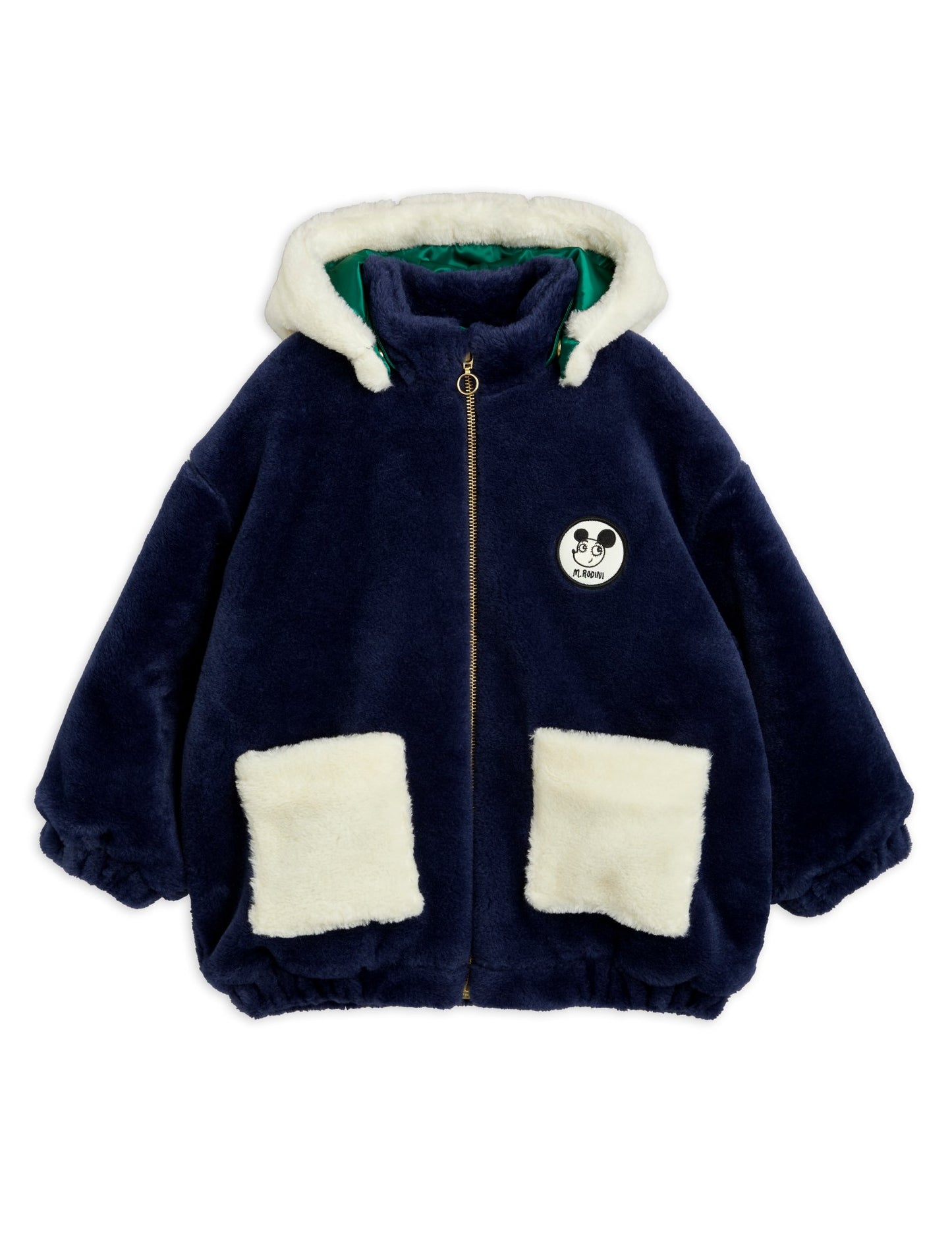 Blue oversized faux fur jacket with an embroidered Ritzratz patch in the front and a large What’s Cooking chenille embroidery in the back, made from 100 % recycled polyester.